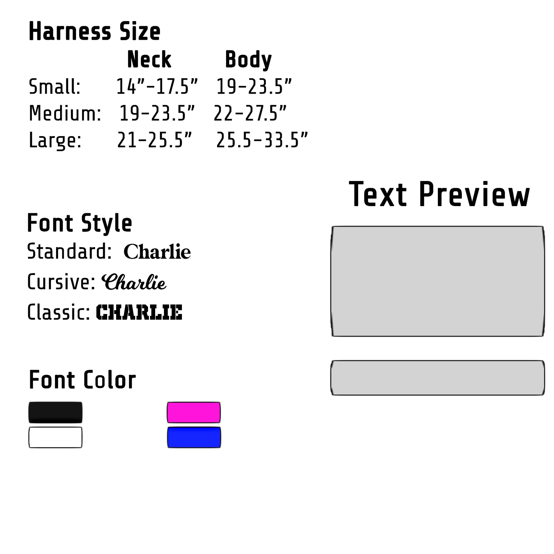 - TRULY UNIQUE - Harnesses available in blue, orange, hot pink and black. Your choice between 3 different custom fonts and 4 font colors to make your dog truly stand out from the rest.